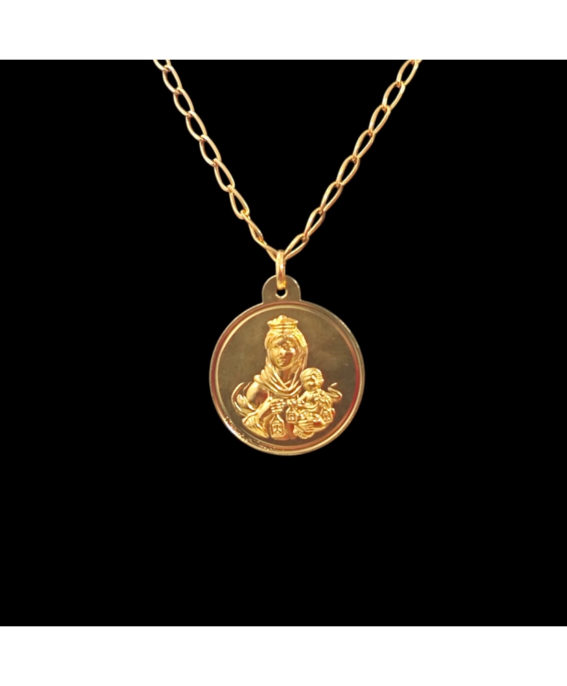 Medalla de oro de 18 kt con la imagen de la Virgen del Carmen, con acabado detallado y forma redonda. Mide 3 cm de diámetro y pesa 6,8 gramos. Ideal como colgante de protección o regalo religioso.