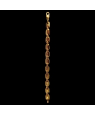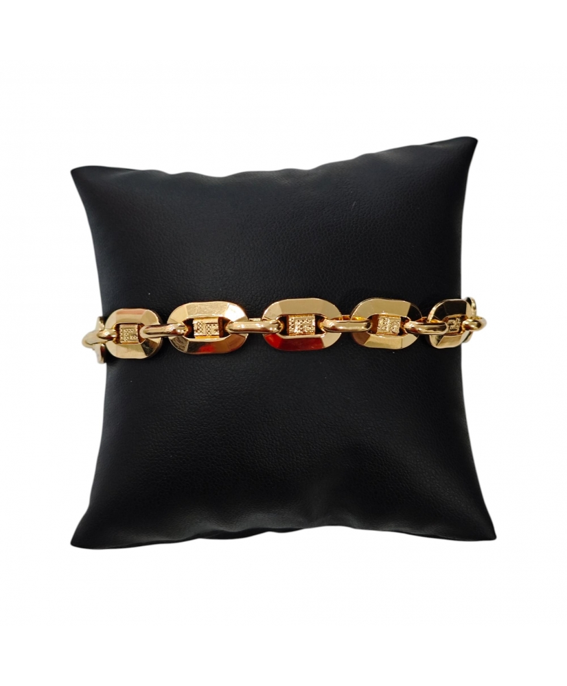 Pulsera de oro de 18 quilates con diseño de eslabones ovalados y detalle central decorado con greca. Tiene un peso de 11,78 gramos, un largo de 22 cm y un ancho de 9 mm. Presenta cierre de mosquetón.