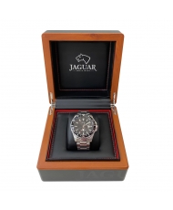 Reloj suizo de hombre Jaguar, de la Colección Pro Diver. El modelo J860/D, de color Negro, con esfera Negra e índices de color Blanco, ofrece una visualización perfecta gracias a su cristal de Zafiro. La elección de un cristal de zafiro garantiza una excepcional visibilidad del reloj y le confiere una enorme resistencia a las rayadas. Por sus características, el cristal de zafiro es excepcionalmente duro. Tan solo el diamante ofrece mayor dureza que este material y es el material de elección para piezas que resistan el paso del tiempo manteniendo su belleza y buena presencia. Además, el cristal que equipa este reloj incluye un tratamiento antireflejos, evitando en gran medida la aparición de incómodos reflejos dificultan la correcta visualización de la esfera en según qué condiciones de iluminación. Este reloj analógico está realizado en acero inoxidable El acero inoxidable , también denominado acero quirúrgico es una aleación de características especiales de gran resistencia a la corrosión y a las rayadas. Además, este material es hipoalergénico de grado quirúrgico, con lo que se evitan posibles reacciones de la piel por su uso continuado. El Jaguar J860/D es un reloj de cuarzo con un movimiento RONDA 6003D fabricado en Suiza, un mecanismo de calidad y precisión contrastadas durante años , e indica con una gran fiabilidad las horas, minutos y segundos.Viene equipado con una correa de acero inoxidable de color plateado y con un cierre desplegable, que permite la regulación del tamaño de la correa de modo sencillo y preciso, para que el reloj se adapte a tu muñeca de la mejor manera posible. Desde su fundación en 1938, los relojes de la marca Jaguar se han mantenido fieles a los valores que impulsaron a su fundador a la aventura de lanzar una nueva marca de relojes: perseguir la más absoluta belleza y fuerza en cada una de las piezas que se manufacturan. Para lograrlo, en Jaguar somos fieles a la tradición relojera de alta precisión suiza, dotándola de las tecnologías más avanzadas para garantizar a los propietarios de un reloj Jaguar la mayor fiabilidad y precisión. Caja Material: Acero Inoxidable Grosor: 12.65 mm Forma: Redonda Diámetro: 43.5 mm Peso: 178 g Esfera Color: Negro Cristal: Zafiro Número de agujas: 3 Correa Material: Acero Inoxidable Color: Plateado Ancho: 21.95 mm Tipo de cierre: Desplegable Movimiento Tipo: Cuarzo Nombre: Ronda 6003d Manufactura: Suiza Tipo de pila: Sr916sw Funciones Función principal: Horas Y Minutos Calendario: Si Características Estanqueidad: 20 ATM