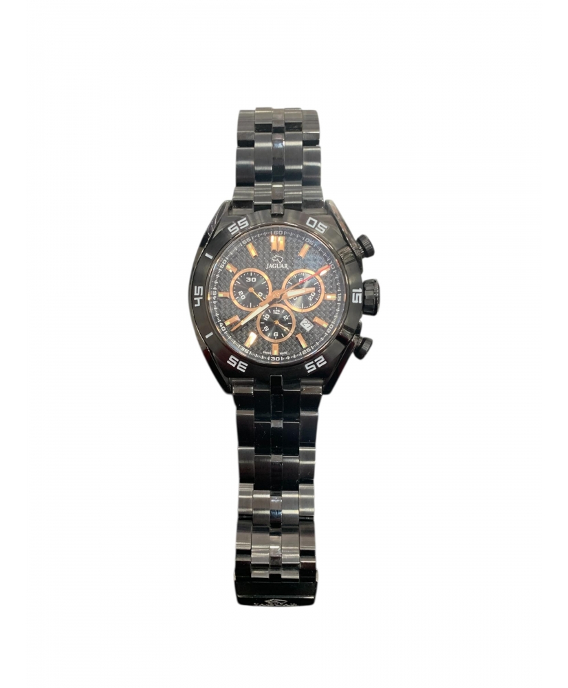 Reloj Jaguar para hombre, Edición Limitada. Diseño con caja de acero de 45.8mm de diámetro con tratamiento ip super black, fondo atornillado, correa de acero con tratamiento ip super black, movimiento de quarzo, cristal de zafiro irrayable, calendario y sumergible 10 ATM. Destacamos la calidad por encima de todo, maquinaria de cuarzo de precisión suiza, última tecnología y como no, nobleza y saber hacer de sus materiales, seleccionados con esmero para el gusto de la vista y del tacto.