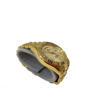 Lotus lanza la colección Freedom con un estilo muy reconocido en el mundo de la relojería. Un diseño contundente siempre en acero y con bisel dentado. El brazalete es tipo President de eslabones redondeados; un modelo que tiene más que probado su resistencia y da la sensación de compacto. En particular, este reloj Lotus 18857/1 de hombres es de cuarzo 3 agujas y calendario a las 3 con visor de lupa además de un espacio para día de la semana a las 12. La caja redonda es de acero inoxidable dorado en oro amarillo de 41,5 mm de diámetro. La esfera es completamente dorada con la numeración romana combinada con índices tipo palo. El brazalete es de acero inoxidable dorada en oro amarillo con cierre desplegable de pulsadores. El cristal es mineral y soporta hasta 10 atmósferas de presión (100 metros)